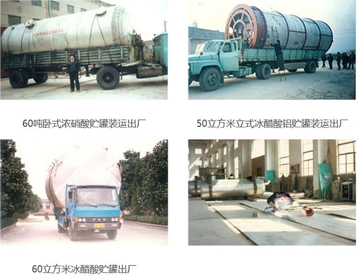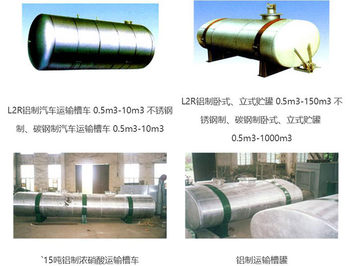 工業(yè)純鋁板制汽車運輸槽車、臥式、立式貯罐、高位槽。(主要用于貯運 濃硝酸、冰醋酸等腐蝕液體)不銹鋼、碳鋼制各種汽車運輸槽車,臥式、 立式貯槽,高位槽計量槽。特殊規(guī)格可按用戶需求設(shè)計、制造。